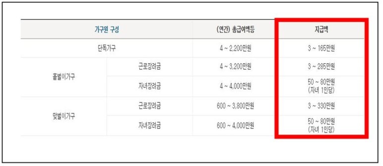 가구원 구성에 따라서 금액이달라지는데 부부합산 총급여액을 기준으로 지급액이 산정됩니다.