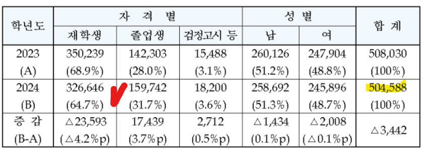 원서 접수 및 변경은 지난 9월 8일까지 이뤄져서 504,588명이 지원했습니다. 이 중 졸업생은 159,742명으로 시험을 치르는 10명 중 3명은 재수 혹은 N수를 한 학생들입니다.