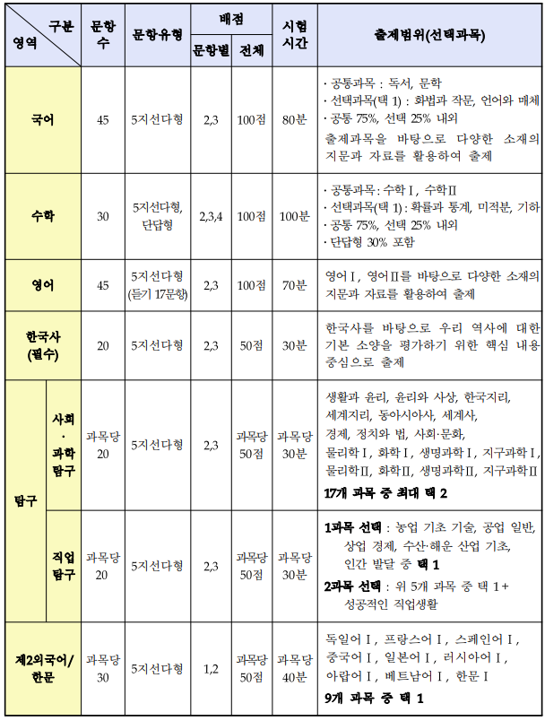 국어, 수학, 직업탐구 영역의 공통과목과 선택과목 1과목 구조로 사회탐구와 과학탐구 영역 17개 과목 중에 최대 2과목을 응시합니다. 제2외국어나 한문의 경우 해당 과목이 필요한 경우에 치르게 됩니다.