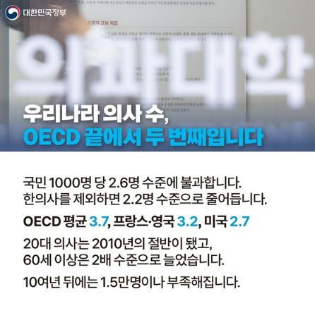 현재 우리나라는 1000 명당 의사 수는 2.3명으로 OECD는 평균 3.5명에 비해 낮은 수치이긴 합니다. 또한, 수도권 집중으로 인해 지방 및 비수도권 지역의 진료기관의 인력 분배 및 확충, 안전망 구축, 공정성 제고 등 개혁을 위한 것으로 발표하였는데요. 이 개혁들 중에 문제가 되는 의사 파업 이유이 일어나고 협회의 반발이 일어나는 핵심은 인력 부분의 의견충돌 때문입니다.