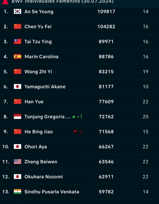 대한민국 배드민턴 국가 대표, 전 세계 배드민턴 여자 단식 1위인 안세영과 9위 허빙자오에 대한 BWF 세계배드민턴 연맹에 등록된 공식 랭킹은 다음과 같습니다. 개인적으로 볼 때 랭킹 10위 안에 선수들의 실력 차이는 정말 종이 한 장 차이일 수 있으며 대회 당일의 다양한 컨디션 변수 로 승패가 판가름 나는 일이 비일비재합니다.