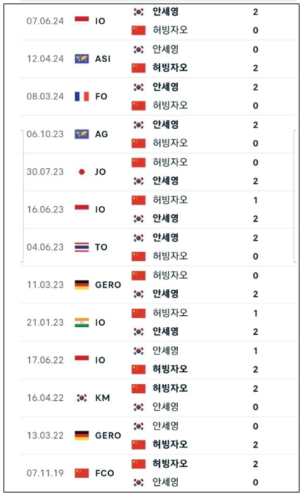 첫 4번의 맞대결은 허빙자오 4연승 그 후 안세영의 7연승 질주 허빙자오의 연패 탈출 후 다시 안세영이 설욕하며 연승을 달리고 있는 안세영이 우세에 있습니다