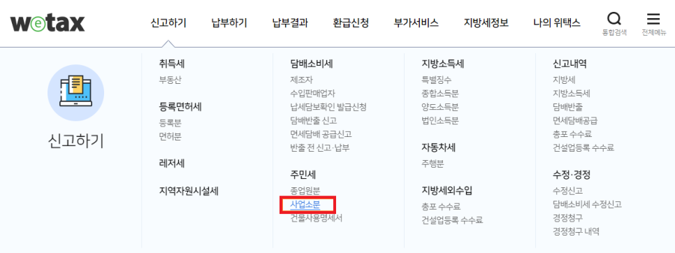 이택스/위택스 - 신고/납부 - 주민세(사업소분)을 찾아보세요~