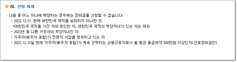 위 기준을 모두 충족하더라도 22년 12월 31일 현재 대한민국 국적을 보유하지 않은 자, 또는 22년 중 다른 거주자의 부양자녀인 자, 배우자를 포함한 거주자가 전문직인 경우는 대상에서 제외됩니다.