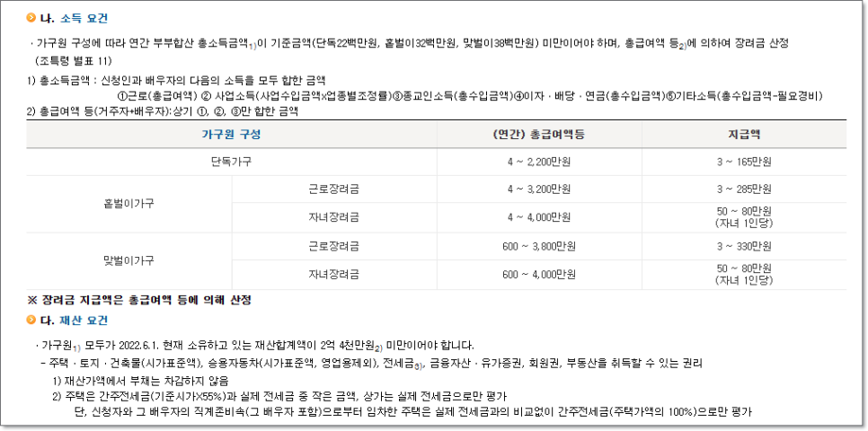 먼저 소득요건은 2022년 부부합산 연간 총소득을 기준으로 단독가구 2,200만원 미만, 홑벌이가구 3,200만원 미만, 맞벌이가구 3,800만원 미만입니다.