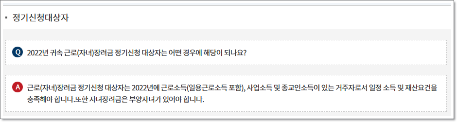 정기신청은 직전년도(전년도) 소득을 기준으로 하여 장려금 산정액의 100%를 모주 지급하고 지급이 되면 환수를 하거나 추가로 지급을 하는 등의 복잡한 절차를 거칠 필요가 없어서 간편합니다.