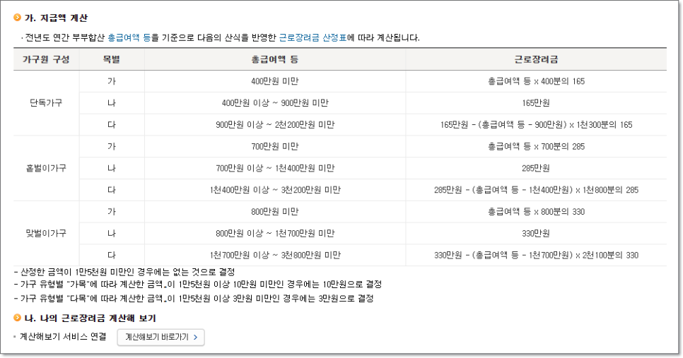 총 소득 2,200만원 이하의 단독가구는 최대 165만원까지, 총 소득 3,200만원 이하의 홑벌이 가구의 경우 최대 285만원까지, 총 소득 3,800만원 이하의 맞벌이 가구는 최대 330만원까지 근로장려금이 지급됩니다.